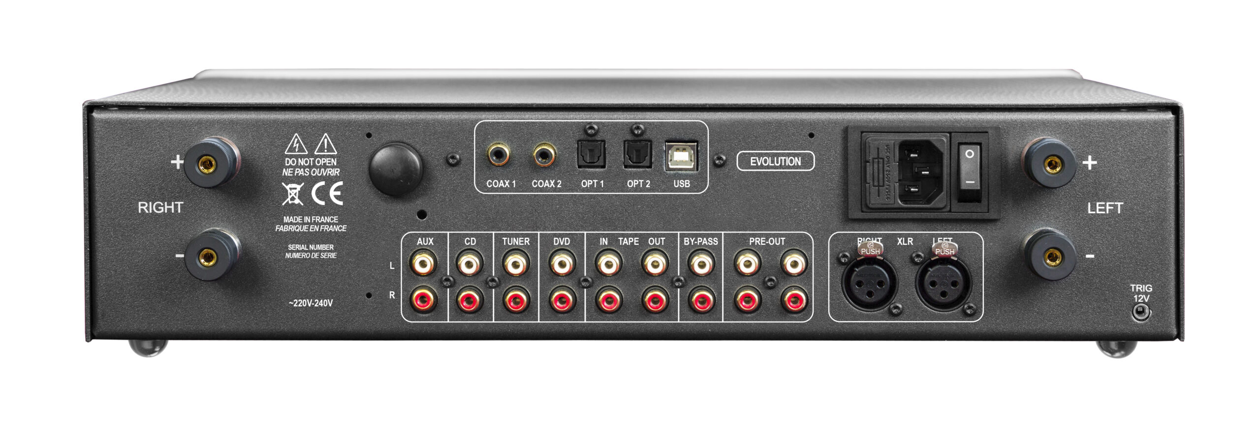 - Connectique : 5x entrées analogiques stéréo RCA dont 1 Phono (avec carte optionnelle P50 ou P100 / 1x entrée XLR stéréo / 1x sortie monitoring / 1x entrée By-pass / 1x sortie casque jack 6.35 (façade) / 2x sorties pré-out stéréo RCA / Borniers en cuivre au tellure / Sortie trigger