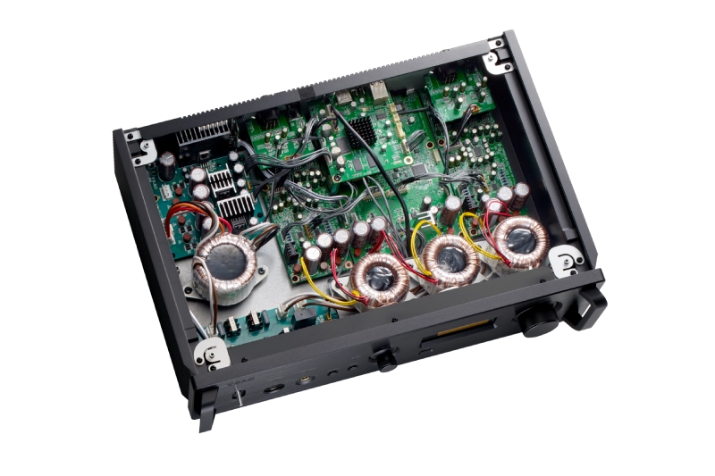 TEAC a intégré une structure double mono, allant du circuit d’alimentation avec des transformateurs à noyau toroïdal gauche et droit indépendants à la section convertisseur numérique-analogique (DAC) et à l’étage de sortie analogique. Cette structure double modèle, qui possède des circuits mono complets pour chacun des deux canaux, empêche les interférences entre les canaux gauche et droit, permettant ainsi la réalisation d’une expression musicale riche qui reproduit le sens de l’espace et de la dimension.